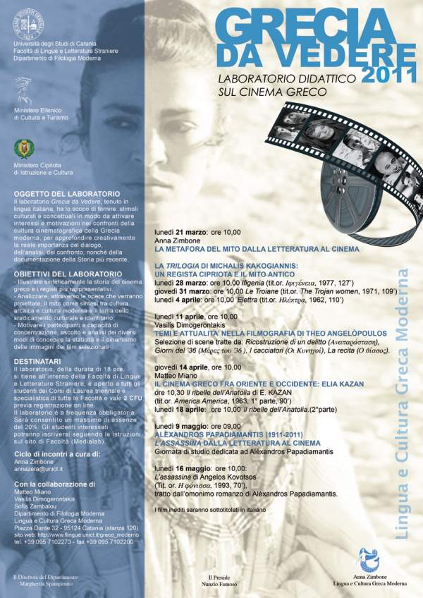 Prende il via lunedì 21 marzo alle 10 (Refettorio Piccolo delle Biblioteche Riunite Civica e Ursino Recupero), il laboratorio didattico sul cinema greco Grecia da vedere, promosso dalla cattedra di Lingua e Cultura Greca moderna (prof.ssa Anna Zimbone). Il laboratorio prevede la proiezione di cinque film greci con sottotitoli in italiano, attraverso un percorso per scoprire che cosa si nasconde dietro un film e come questo susciti le nostre emozioni. Un corso-laboratorio per imparare a “leggere” e analizzare una pellicola e le sue forme espressive, imparando a riconoscerne le peculiarità.