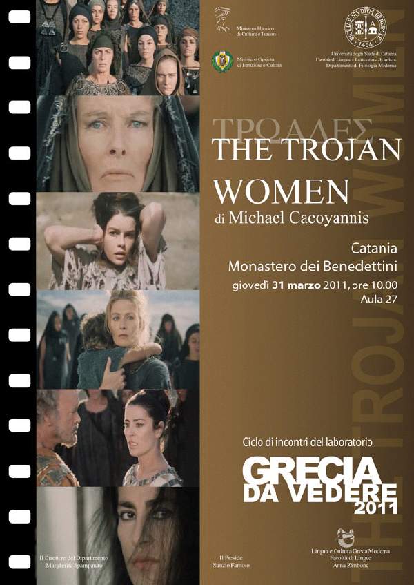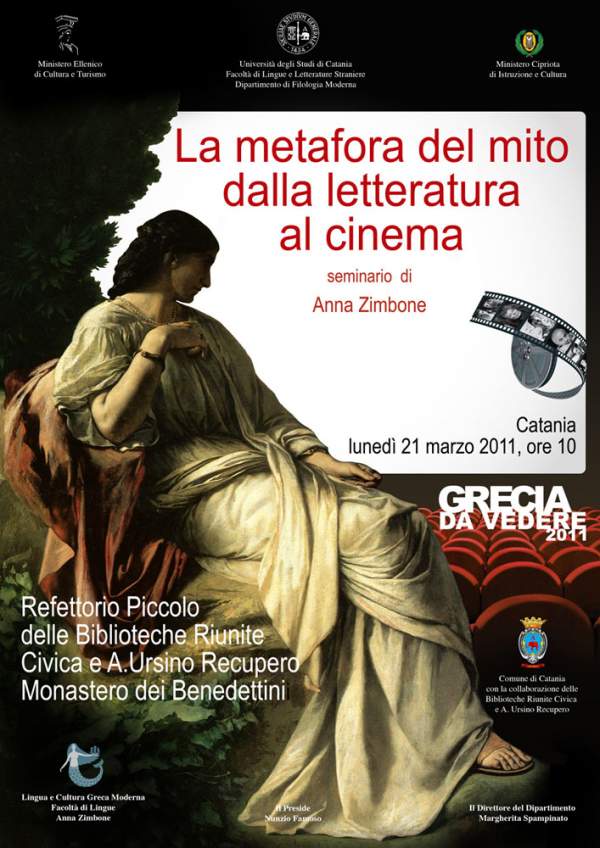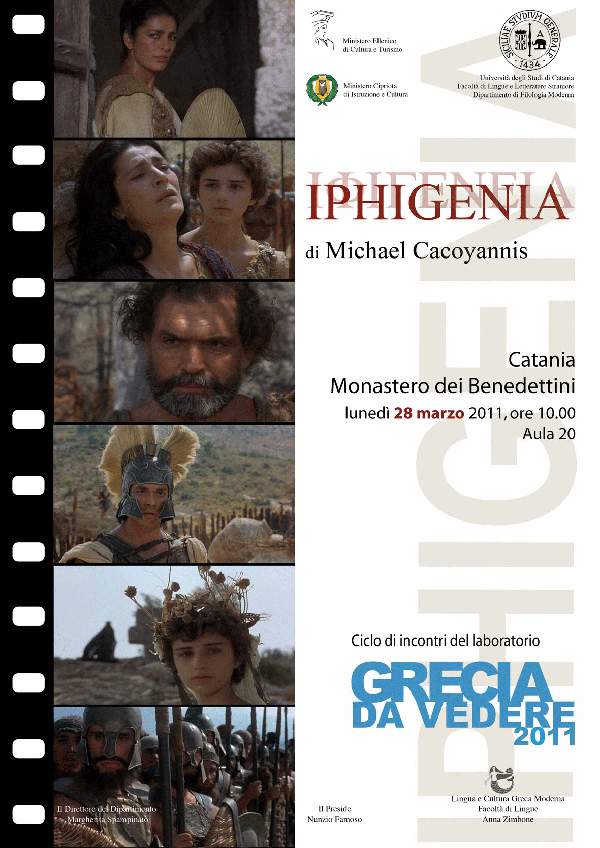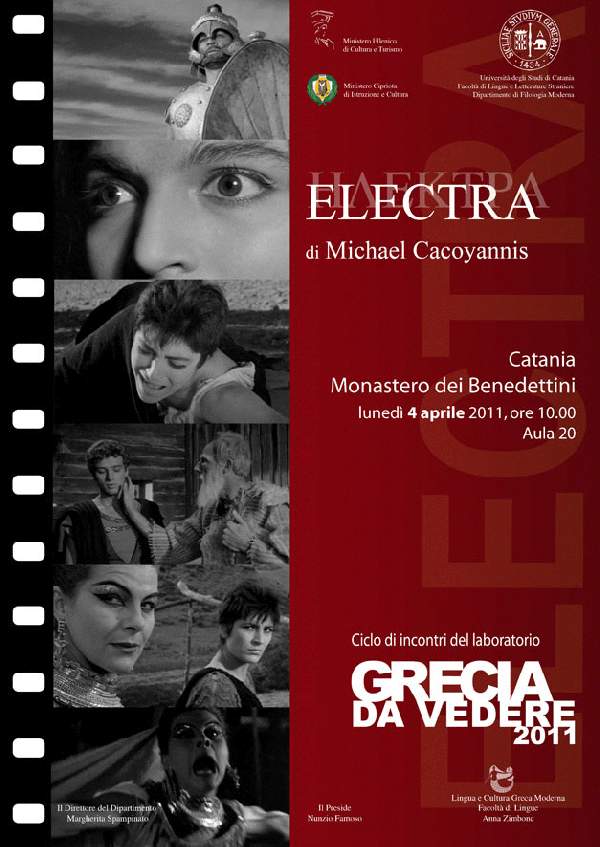 Lunedì 21 marzo alle 10, al Refettorio Piccolo delle Biblioteche Riunite Civica e Ursino Recupero, la prof.ssa Anna Zimbone curerà la presentazione del laboratorio nel corso della dell'incontro dal titolo “La metafora del mito dalla letteratura al cinema”, che anticipa le proiezioni della prima unità tematica del laboratorio incentrata su Michalis Kakogiannis e Theo Angelòpoulos. Si comincia con la trilogia "Michalis Kakogiannis: un regista cipriota e il mito antico”: le proiezioni si svolgeranno lunedì 28 marzo, ore 10, film: Ifigenia (titolo originale Ιφιγένεια, 1977, 127’); giovedì 31 marzo, ore 10, film: Le Troiane (titolo originale The Trojan women, 1971, 109’); lunedì 4 aprile, ore 10, film: Elettra (titolo originale Ηλέκτρα, 1962, 110’).