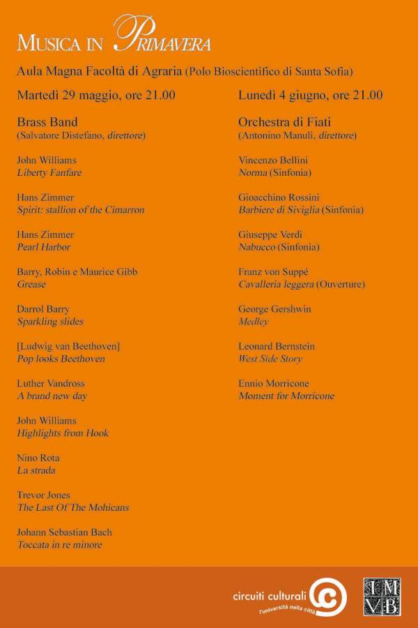 La rassegna nelle facoltà prosegue martedì 29 maggio alle 21, nell'aula magna della facoltà di Agraria (Polo Bioscientifico di Santa Sofia), con l'esibizione della Brass Band, diretta dal maestro Salvatore Distefano.