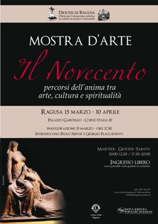 Martedì 15 marzo alle 17:30, al Palazzo Garofalo (c.so Italia 87, Ragusa), s'inaugura la mostra d'arte promossa dalla Diocesi di Ragusa sul tema del discernimento, dal titolo Il Novecento, percorsi dell'anima tra arte, cultura e spiritualità. E' prevista la presenza del Vescovo, del Sindaco di Ragusa e del Presidente del Lions Club (ente coo-promotore della mostra). Introdurranno il prof. Paolo Nifosì e il prof. Giorgio Flaccavento. L’ingresso è libero.