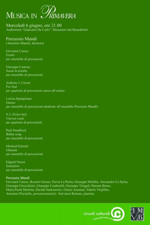La rassegna nelle facoltà prosegue mercoledì 6 giugno alle 21, nell'auditorium "Giancarlo De Carlo" del Monastero dei Benedettini, con l'esibizione dei Percussio Mundi (Antonino Manuli, direttore).
