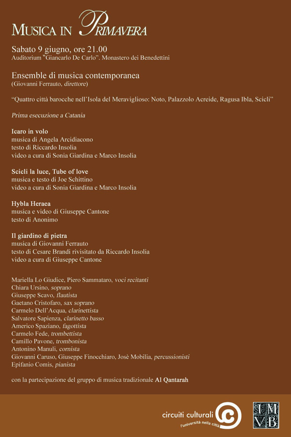 La rassegna nelle facoltà prosegue sabato 9 giugno alle 21, nell'auditorium "Giancarlo De Carlo" del Monastero dei Benedettini, con l'esibizione dell'Ensemble di musica contemporanea, diretto da Giovanni Ferrauto.