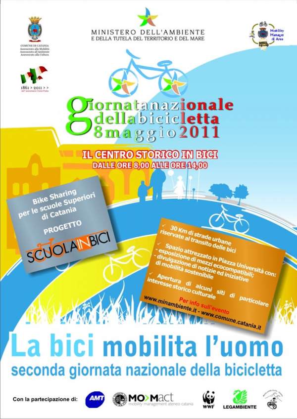 Anche per il 2011, il Ministero dell’Ambiente dedica la seconda domenica di maggio alla bicicletta. L’8 maggio, infatti, in collaborazione con l’Anci e la Federazione Ciclistica Italiana si svolgerà la seconda edizione della Giornata Nazionale della Bicicletta, alla quale aderiscono anche la città di Catania e l'Ufficio del Mobility Management (Momact) dell'Università di Catania. Un’occasione di festa e di partecipazione popolare ma anche un modo per sottolineare come una mobilità alternativa e ecocompatibile può essere effettivamente realizzabile.