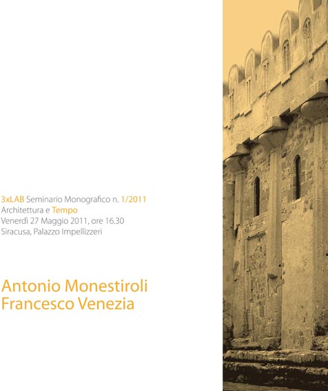 Venerdì 27 maggio alle 16:30, nell'aula magna di Palazzo Impellizzeri (facoltà di Architettura, in via della Maestranza 99), nell’antico quartiere dell’isola di Ortigia di Siracusa, si terranno le due prime lezioni dell’edizione 2010-11 del 3xLAB, Parole di architetto, incentrato quest'anno sul tema Architettura e Tempo.