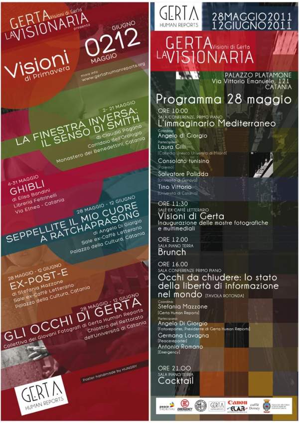 Alle 11:30 è prevista l'inaugurazione delle mostre fotografiche e multimediali "Seppellite il mio cuore a Ratchaprasong" (di Angelo Di Giorgio, Sale ex Caffè Letterario, Palazzo della Cultura di Catania, dal 28 maggio al 12 giugno), "Ex-Post-E" (di Stefania Mazzone, Sale ex Caffè Letterario, Palazzo della Cultura di Catania, dal 28 maggio al 12 giugno), "Gi occhi di Gerta" (Collettiva dei giovani fotografi di Gerta Human Reports, Chiostro del Palazzo centrale dell'Università di Catania, dal 28 maggio al 12 giugno).