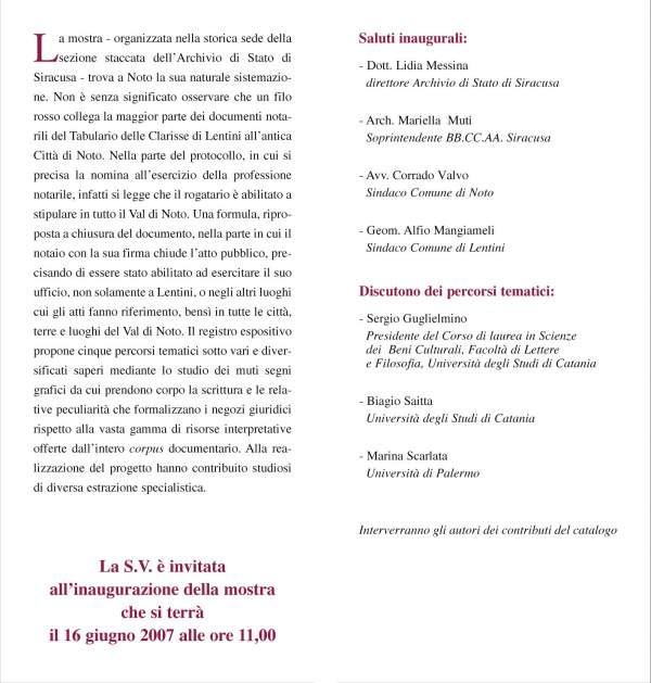 È stata inaugurata sabato 16 giugno, a Palazzo Impellizzeri di Noto, la mostra documentaria sul Tabulario dei Monasteri di Santa Chiara e della Santa Trinità di Lentini dal titolo