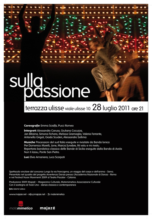 Sulla Passione è il risultato finale di un laboratorio coreografico proposto dalla compagnia MotoMimetico. Diretti dai due coreografi Emma Scialfa e Pucci Romeo, i danzatori sono stati protagonisti di un viaggio tra temi di complessa suggestione culturale, pervenendo alla scoperta e quindi all’analisi di una gestualità e di elementi rinvenibili nella cultura mediterranea.