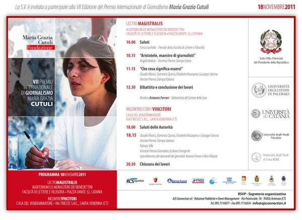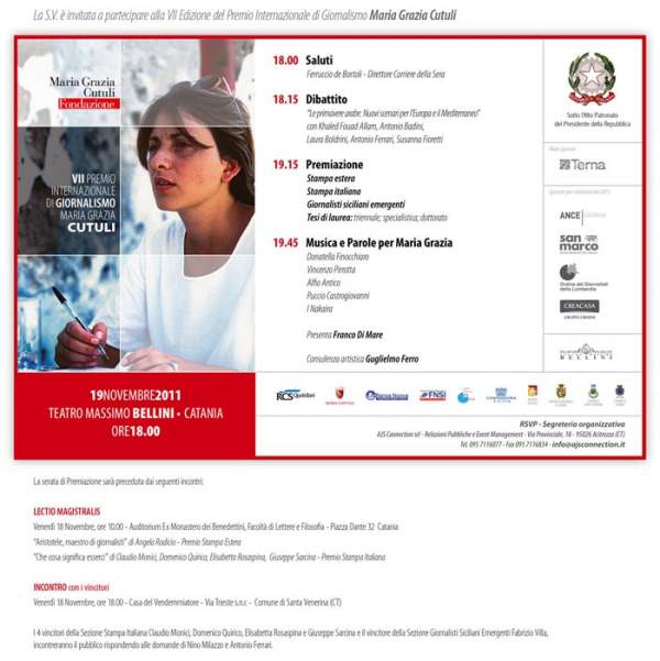 La settima edizione del Premio Internazionale di Giornalismo Maria Grazia Cutuli, si concluderà sabato 19 novembre al Teatro Massimo Vincenzo Bellini di Catania, con una serata–evento, presentata dal giornalista Franco Di Mare. Introdurrà i lavori, alle 18, il direttore del Corriere della Sera e presidente della Giuria del Premio, Ferruccio de Bortoli.