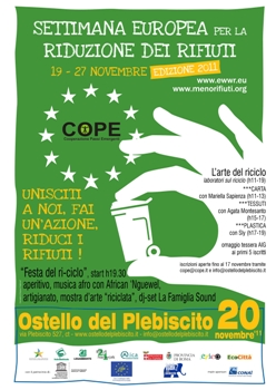 Dal 19 al 27 novembre si svolgerà la Settimana per la Riduzione dei Rifiuti, indetta dalla Commissione Europea, a cui il CO.P.E. aderisce invitando a scoprire che le risposte sono azioni facili, che fanno risparmiare e che possono essere anche divertenti. Domenica 20 novembre, il CO.P.E. organizza una interessante iniziativa, una giornata all’insegna di arte e musica per fare cultura e informazione con i laboratori “l'Arte del Riciclo”; l’azione di compostaggio domestico. Una festa concluderà la giornata, con un aperitivo solidale, la musica dal vivo dei percussionisti di African 'Nguewel e il djset di Daniele de La Famiglia Sound.