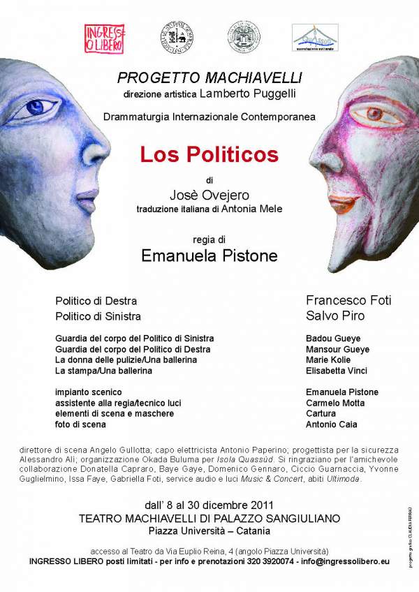 Da giovedì 8 a venerdì 30 dicembre, al Teatro Machiavelli di Palazzo Sangiuliano (ingresso da via Euplio Reina 4, angolo piazza Università, Catania), per il ciclo Drammaturgia Internazionale Contemporanea, va in scena lo spettacolo Los Politicos di Josè Ovejero, per la regia di Emanuela Pistone.