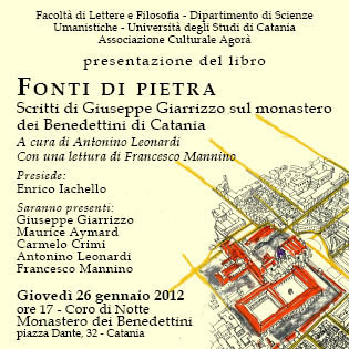 Giovedì 26 gennaio alle 17, nel Coro di notte del Monastero dei Benedettini, si tiene la presentazione del libro Fonti di pietra. Scritti di Giuseppe Giarrizzo sul monastero dei Benedettini di Catania (Editoriale Agorà, Catania) a cura di Antonino Leonardi.