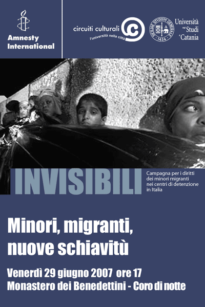 Venerdì 29 giugno alle 17, nel “Coro di notte" dell’ex Monastero dei Benedettini, si terrà la conferenza Minori, migranti, nuove schiavitù: a due anni dalla Campagna Invisibili una panoramica sugli obiettivi raggiunti, la condizione dei migranti in Europa e la regia della criminalità sulle nuove schiavitù, organizzata dalla Circoscrizione Sicilia di Amnesty International e dai Circuiti culturali dell’Università di Catania.