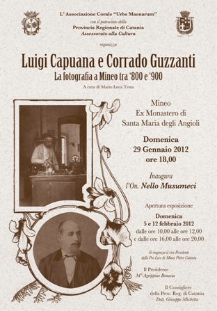 Domenica 5 e 12 febbraio, all'ex Monastero di Santa Maria degli Angeli di Mineo (Ct), sarà presentata la mostra, Luigi Capuana e Corrado Guzzanti - La fotografia a Mineo tra '800 e '900, inaugurata lo scorso 29 gennaio, e organizzata dall'Associazione Corale Urbs Maenarum, con il patrocinio della Provincia regionale di Catania.