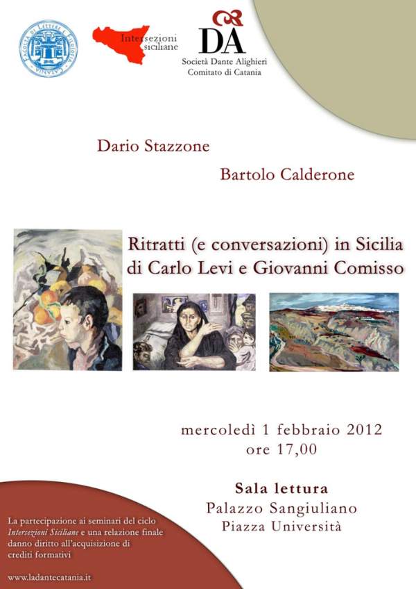 Mercoledì 1° febbraio alle 17, nella Sala di Lettura di Palazzo Sangiuliano, in piazza Università 16 (II piano), conferenza di Dario Stazzone e Bartolo Calderone sul tema Ritratti (e conversazioni) in Sicilia di Carlo Levi e Giovanni Comisso. L'incontro fa parte del ciclo di seminari "Intersezioni siciliane" organizzato dal Comitato catanese della Società Dante Alighieri e dall'Università di Catania.
