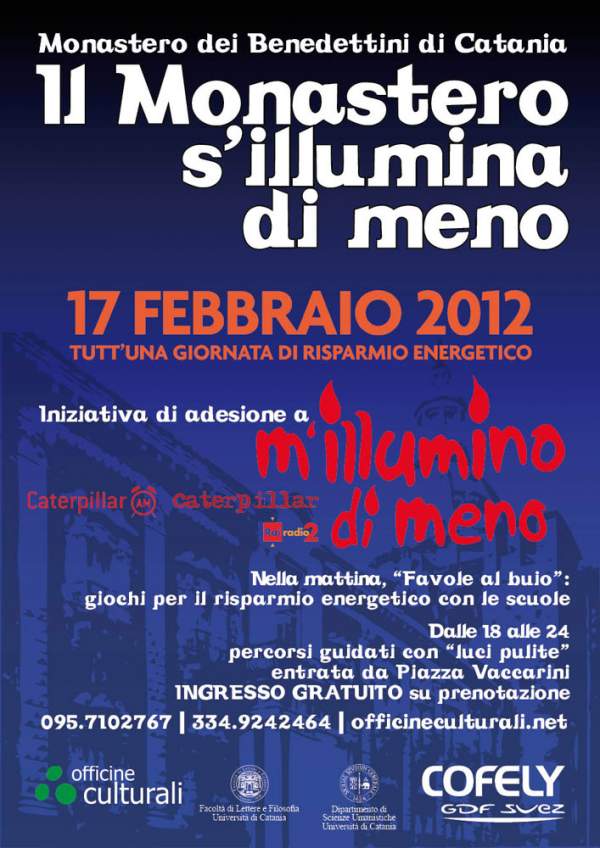Torna anche per il 2012 Il Monastero s’illumina di meno. L’associazione Officine Culturali, la facoltà di Lettere e Filosofia dell’Università di Catania e il dipartimento di Scienze Umanistiche partecipano anche quest’anno all’iniziativa nazionale “M’illumino di meno” indetta da Caterpillar, programma radiofonico di Rai Radio 2.