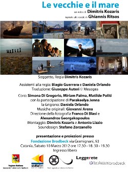 Venerdì 6 aprile (ore 17:30 - 18:30 - 19:30), alla Fondazione Brodbeck di Catania, sarà presentato il video Le vecchie e il mare dell'artista greco Dimitri Kozaris, ispirato alla corale di Ghiannis Ritsos. L'ingresso è libero.