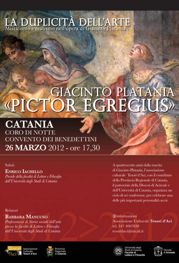 Giacinto Platania «Pictor Egregius». Si tratta del primo incontro di un ciclo di sei conferenze "Misticismo e realismo nell’opera di Giacinto Platania" promosse, in occasione dei quattrocento anni dalla nascita del grande pittore e decoratore di Acireale Giacinto Platania, dall’associazione culturale “Tesori d’Aci”, in collaborazione con la facoltà di Lettere e Filosofia dell’Università di Catania e con il contributo della Provincia regionale di Catania e la Diocesi di Acireale.
