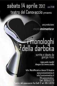 Sabato 14 aprile alle 21, al Teatro del Canovaccio di Catania (Via Gulli, 12), andrà in scena I monologhi della Darboka, uno spettacolo scritto, ideato e interpretato da Giorgio Rizzo. La