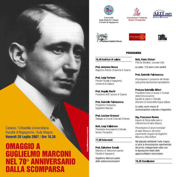 venerdì 20 luglio alle 16.30, nell’aula magna della facoltà di Ingegneria dell'Università di Catania, il convegno “Omaggio a Guglielmo Marconi”, un evento celebrativo in memoria del “padre della radio”, organizzato dall’associazione culturale Romeo Prampolini, dall’Associazione elettrotecnici italiani “Aiet”, dalla Fondazione Marconi di Bologna, dall’emittente d’ateneo Radio Zammù e dal settore Circuiti Culturali dell’Università.