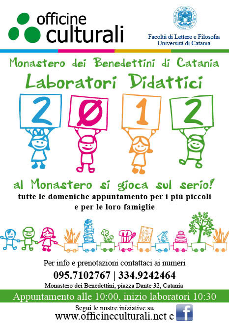 Domenica 20 maggio l'associazione Officine Culturali, in collaborazione con il dipartimento di Scienze Umanistiche, dà appuntamento al Monastero dei Benedettini di Catania per un nuovo appuntamento rivolto ai bambini, all'insegna del gioco e del divertimento.