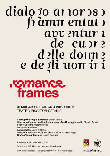 tra sogno e veglia, utilizzando i passaggi sonori, i frammenti di dialogo, i rumori, le musiche, perché si restituisca in movimento danzato ed interpretazione la loro situazione emotiva, senza riferimenti diretti: il montaggio e la decostruzione del senso e della sensibilità, nascono dall’emozione educata dal cinema, e facendone materia d’esperienza indirizzano una coreografia del discorso amoroso: si è scelto infatti di partire dalla situazione amorosa - non tanto dal film d’amore vero e proprio - attraversata in diversi modi dal testo filmico frammentato, ed intesa in senso ampio di “avventura romanza”, quella personale avventura del cuore delle donne e degli uomini in cui scava il viaggio di Romance Frames, viaggio di incontro e abbandono, paura e gelosia, disprezzo e coraggio, monotonia, l’eros, il mistero, la provocazione e non ultima, la solitudine delle passioni.