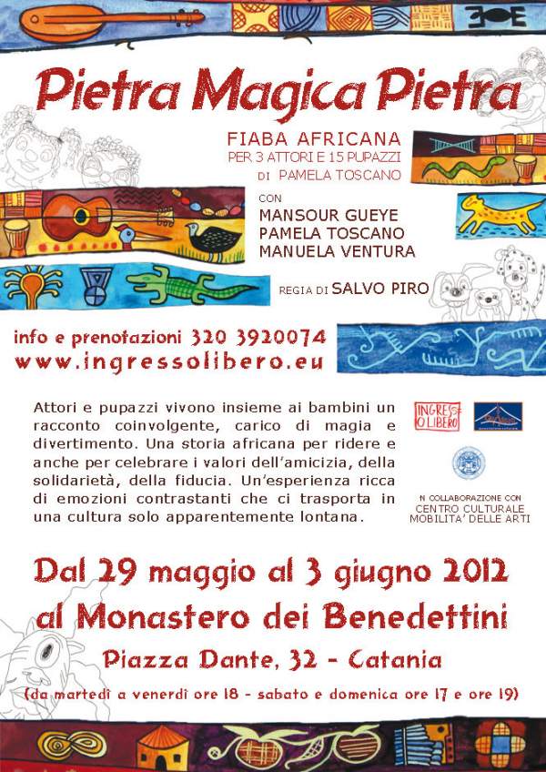 Da martedì 29 maggio a domenica 3 giugno, va in scena, nel cortile del Monastero dei Benedettini (piazza Dante 32), dentro un teatrino da campo costruito sotto le maestose fronde dei ficus, lo spettacolo di Pamela Toscano Pietra magica pietra. Con Pamela Toscano, Manuela Ventura e Mansour Gueye, per la regia di Salvo Piro.