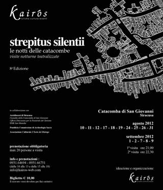 Da venerdì 10 agosto a domenica 9 settembre, è in programma l'ottava edizione di Strepitus silentii. Le notti delle catacombe, una rassegna in notturna di visite teatralizzate della Catacomba di San Giovanni di Siracusa (piazza San Giovanni Evangelista), accompagnati da attori e musicisti professionisti.