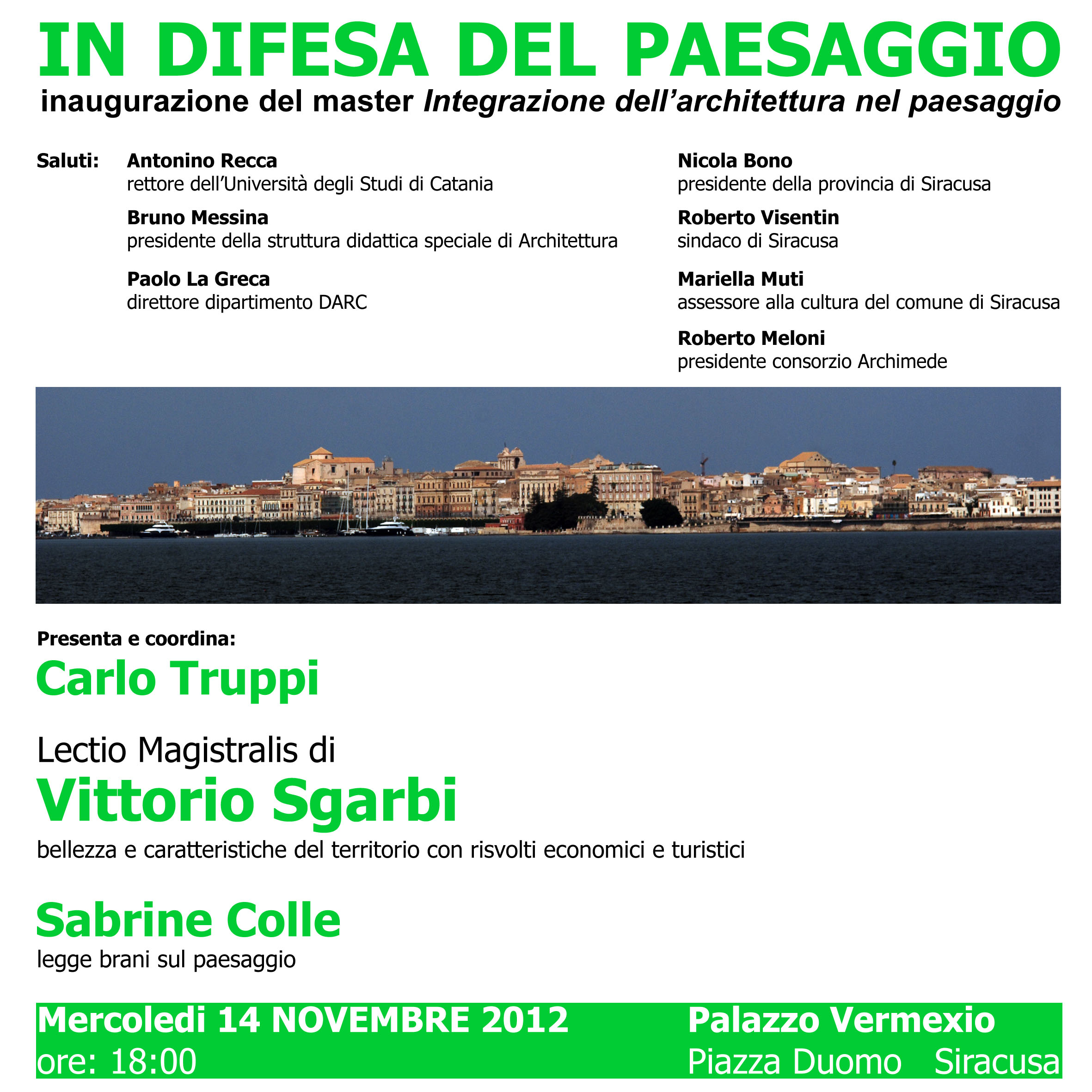 Mercoledì 14 novembre alle 18, al Palazzo Vermexio (Siracusa), la lezione magistrale In difesa del paesaggio del critico d’arte Vittorio Sgarbi inaugura le attività didattiche del master “Integrazione dell’architettura nel paesaggio”, promosso dalla Struttura didattica speciale di Architettura, con la collaborazione del Consorzio universitario Archimede e il coordinamento del prof. Carlo Truppi, past-preside della facoltà.