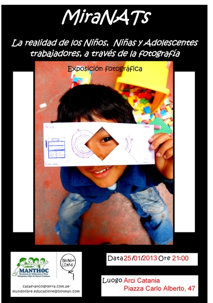 Venerdì 25 gennaio alle 21, nella sede dell'Arci Catania (piazza Carlo Alberto, 47), sarà presentata MiraNATs, una mostra fotografica interamente realizzata dai bambini e adolescenti lavoratori del Manthoc di Lima al termine di un laboratorio di fotografia sociale.
