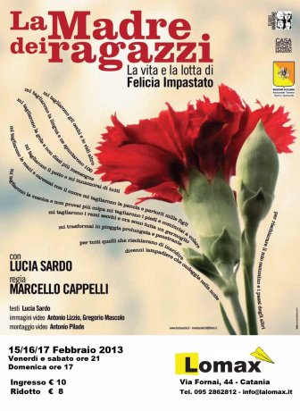 Dal 15 al 17 febbraio, alla Sala Lomax di Catania, la prima stagione teatrale "Scena Nuda" presenta il secondo appuntamento con il teatro con lo spettacolo La Madre dei Ragazzi - spettacolo sulla vita e la lotta di Felicia Impastato di Marcello Cappelli, con Lucia Sardo.