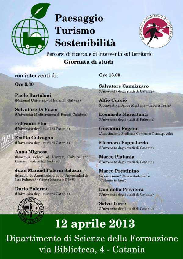 Venerdì 12 aprile alle 9:30, al dipartimento di Scienze della Formazione dell'Università di Catania, si svolge la giornata di studi dal titolo Paesaggio, turismo, sostenibilità. Percorsi di ricerca e di intervento sul territorio incentrata sulle problematiche della sostenibilità ambientale e paesaggistica, in cui si affronteranno anche diverse questioni relative alle peculiarità delle attività turistiche. La giornata è organizzata dal dipartimento di Scienze della Formazione, il comitato scientifico è composto dai docenti Febronia Elia, Marco Platania e Salvo Torre.