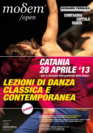 Domenica 28 aprile, allo Scenario Pubblico di Catania (via Teatro Massimo, 16), in occasione della Giornata Mondiale della Danza, Scenario Pubblico international choreographic centre Sicily e compagnia zappalà danza offrono delle lezioni gratuite di danza classica e contemporanea per danzatori dai 16 anni in su.
