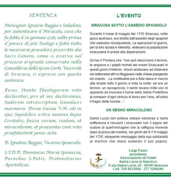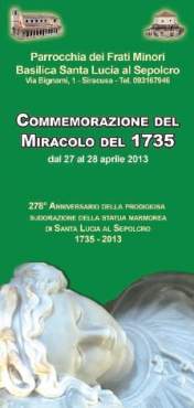 Domenica 28 aprile alle 9:30, nella chiesa di Santa Lucia al Sepolcro (piazza Santa Lucia, Siracusa), nell'ambito del calendario di manifestazioni sulla Commemorazione del Miracolo del 1735, si terrà la conferenza Santa Lucia e la catacomba omonima. Storia, rito e archeologia.