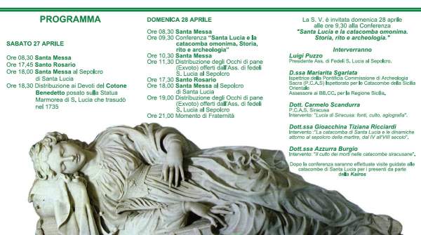 Interverranno: Carmelo Scandurra (P.C.A.S. Siracusa), "Lucia di Siracusa: fonti, culto, agiografia"; Gioacchina Tiziana Ricciardi, "La Catacomba di S. Lucia e le dinamiche attorno al sepolcro della Martire, dal IV all'VIII secolo"; Azzurra Burgio, "Il culto dei morti nelle catacombe siracusane".
