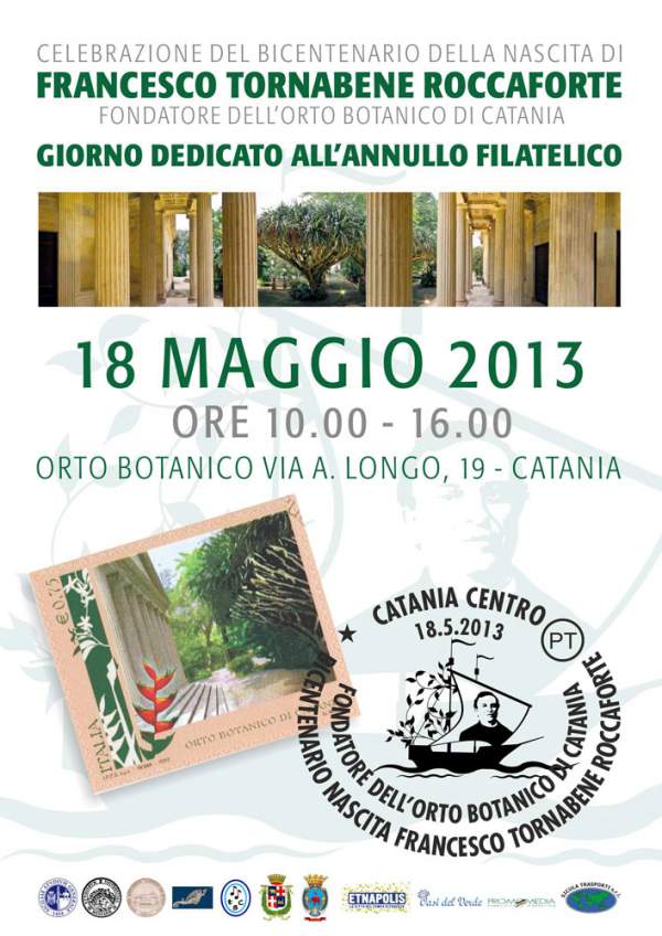 La celebrazione sarà sottolineata con un annullo filatelico che sarà apposto su cartoline della Marina Miliare italiana e sul francobollo dell’Orto Botanico di Catania, a istituzionalizzare una nuova sinergia tra Marisicilia “Comando della Marina Militare Italiana di Augusta” e il Dipartimento di Scienze Biologiche, Geologiche e Ambientali. Il sigillo rappresenta il “vascello della biodiversità” e include il ritratto Francesco Tornabene Roccaforte.