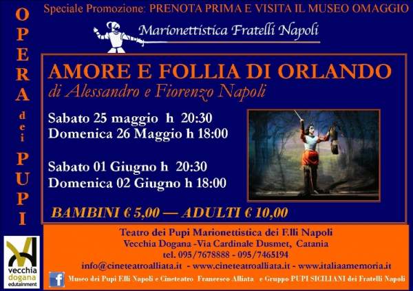 Sabato 25 (ore 20:30) e domenica 26 maggio (ore 18), al Cine Teatro Francesco Alliata di Catania, andrà in scena lo spettacolo Amore e Follia di Orlando di Alessandro e Fiorenzo Napoli.