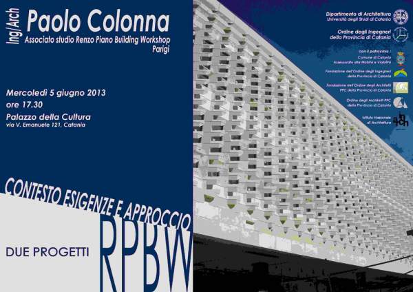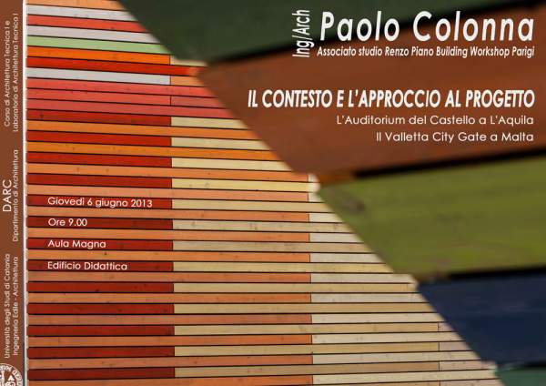 Mercoledì 5 e giovedì 6 giugno, Paolo Colonna, associato del Renzo Piano Building Workshop (RPBW) di Parigi, sarà ospite del dipartimento di Architettura dell'Università di Catania per tenere due seminari sul tema del rapporto tra il contesto, le esigenze e l'approccio al progetto architettonico, con particolare riferimento a due realizzazioni dello studio, l'Auditorium del Castello a L'Aquila e il Valletta City Gate a Malta.