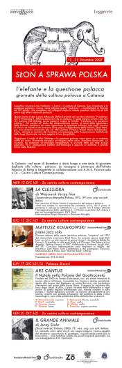 Da mercoledì 12 a venerdì 21 dicembre a Catania si darà luogo a una serie di giornate dedicate alla cultura polacca, dal titolo: Słoń a sprawa polka - L’elefante e la questione polacca. La rassegna è promossa dall' Istituto Polacco di Roma e da Leggerete in collaborazione con l' Associazione Musicale Etnea, Fuoricircuito e Zo - Centro Culture Contemporanee.