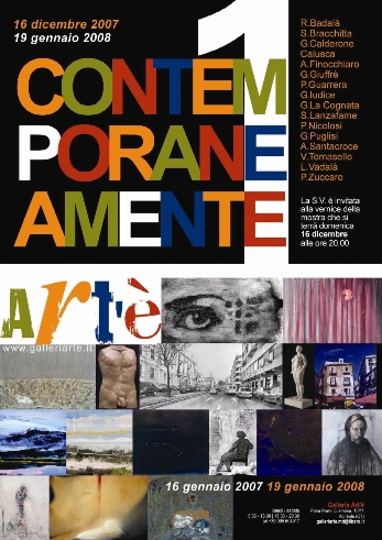 Domenica 16 dicembre alle 20 alla Galleria Art’è, Acireale, piazza Porta Cusmana n. 10/11, Acireale, si inaugura la mostra collettiva di artisti Siciliani, dal titolo: ContemporaneamenteUno. La mostra, a ingresso libero, aprirà la nuova stagione espositiva della giovane galleria. L’esposizione rimarrà aperta fino al 19 gennaio 2008 e vede esposte le opere di sedici artisti Siciliani presenti all’inaugurazione, ossia: Riccardo Badalà, Sandro Bracchitta, Giuseppe Calderone, Calusca, Alessandro Finocchiaro, Gaetano Giuffrè, Paolo Guarrera, Giovanni Iudice, Giovanni La Cognata, Salvatore Lanzafame, Paolo Nicolosi, Giuseppe Puglisi, Antonio Santacroce, Vincenzo Tomasello, Luciano Vadalà, Piero Zuccaro