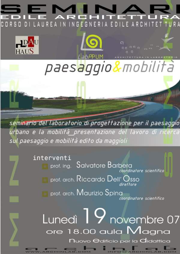 Lunedì 19 novembre alle 18 nell’aula magna del nuovo edificio per la didattica della facoltà di Ingegneria, viale A. Doria 6, si terrà il secondo incontro per l' anno accademico 2007/08 del ciclo di Seminari di Ingegneria Edile-Architettura, dal titolo Paesaggio & Mobilità: seminario del laboratorio di progettazione per il paesaggio urbano e la mobilità LabPpum _ presentazione del lavoro di ricerca sul paesaggio e mobilità edito da Maggioli.